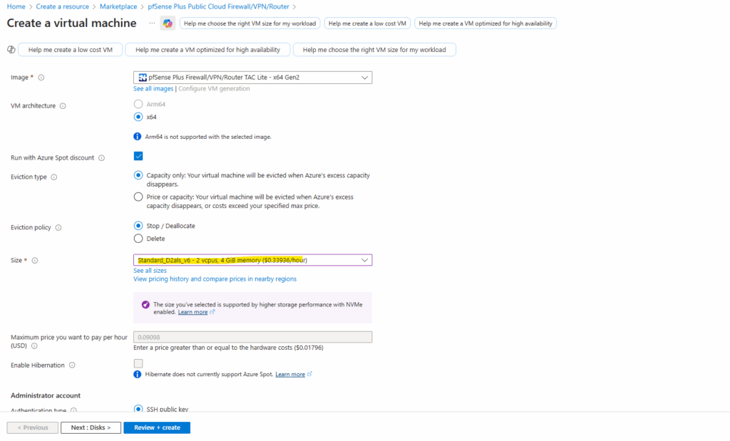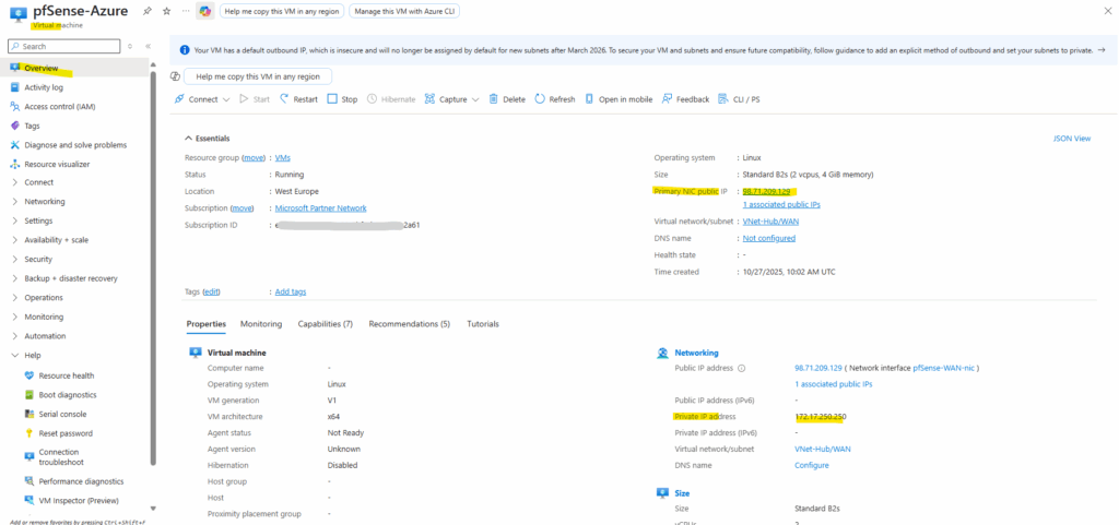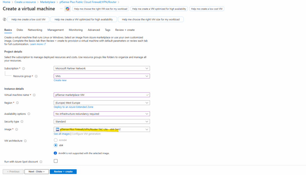 Instead of importing your own VHD, you can also deploy pfSense directly from the Azure Marketplace, where Netgate provides a fully supported image that already includes Azure-specific integrations and a working guest agent.