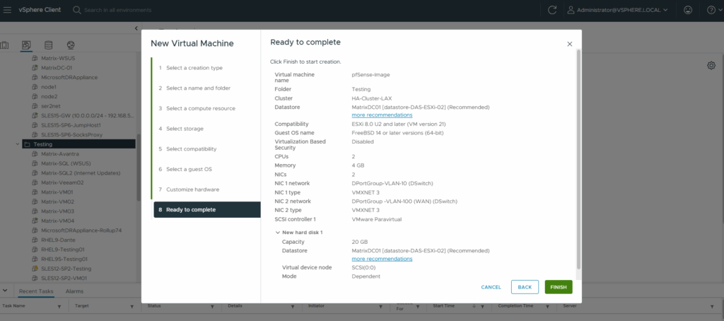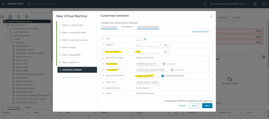 For the disk size I will set 20 GB, further I will select 2 CPUs and 4 GB RAM in my vSphere lab environment. We also need to add at least two network interfaces (LAN + WAN).