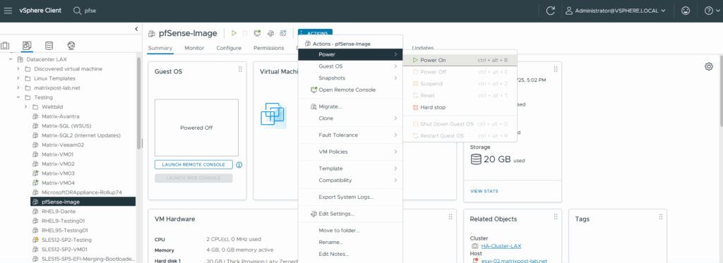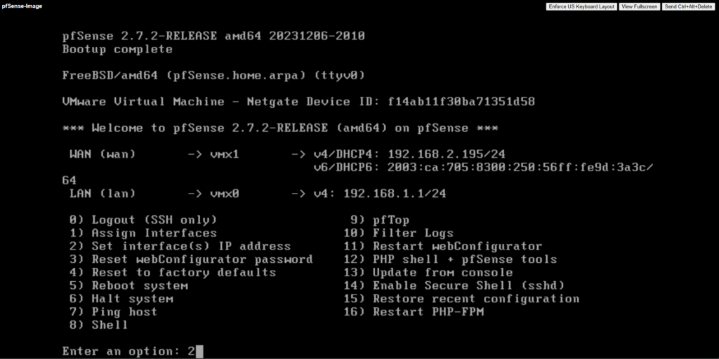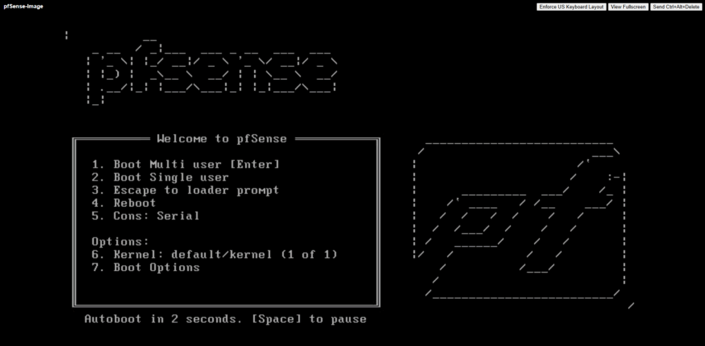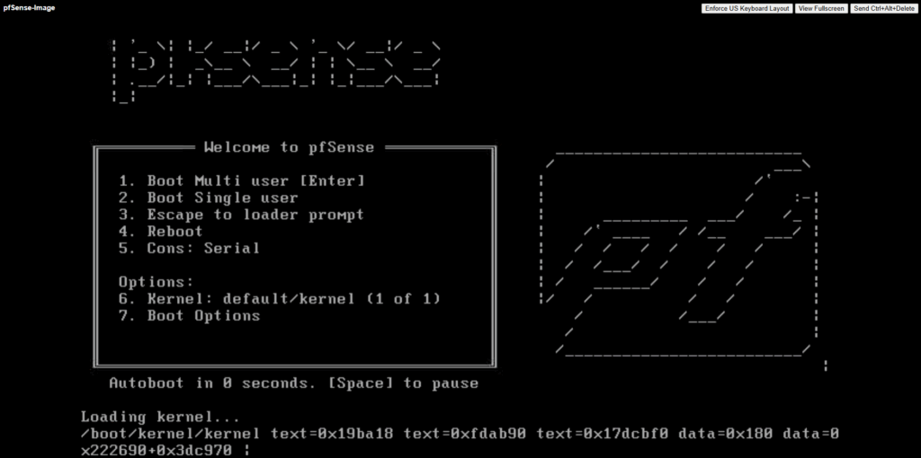 The VM simply powers on and boots directly from the disk you provided, in our case, pfSense is up and running within seconds.