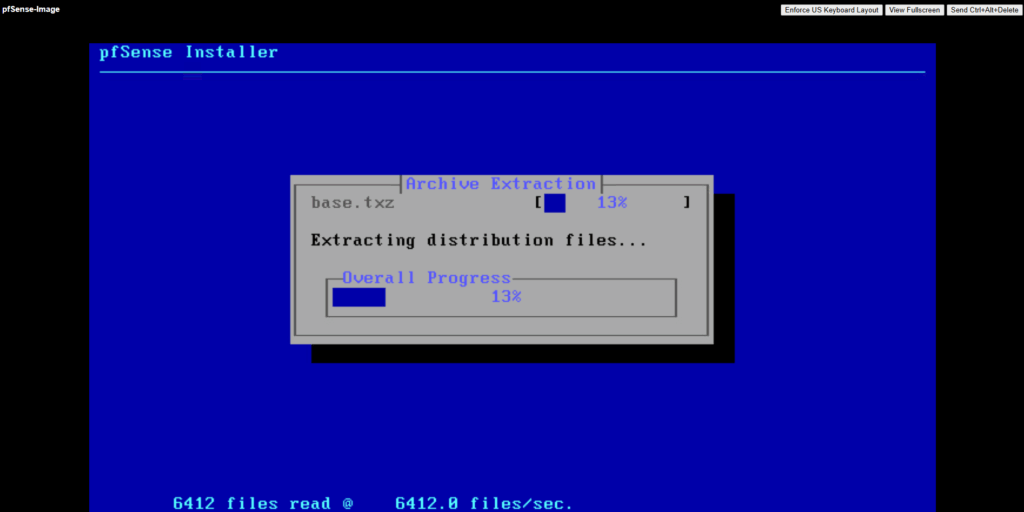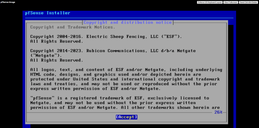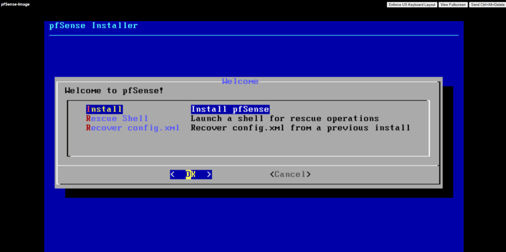 The virtual machine boots from the mounted pfSense installer (ISO).