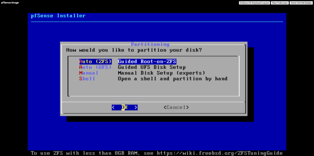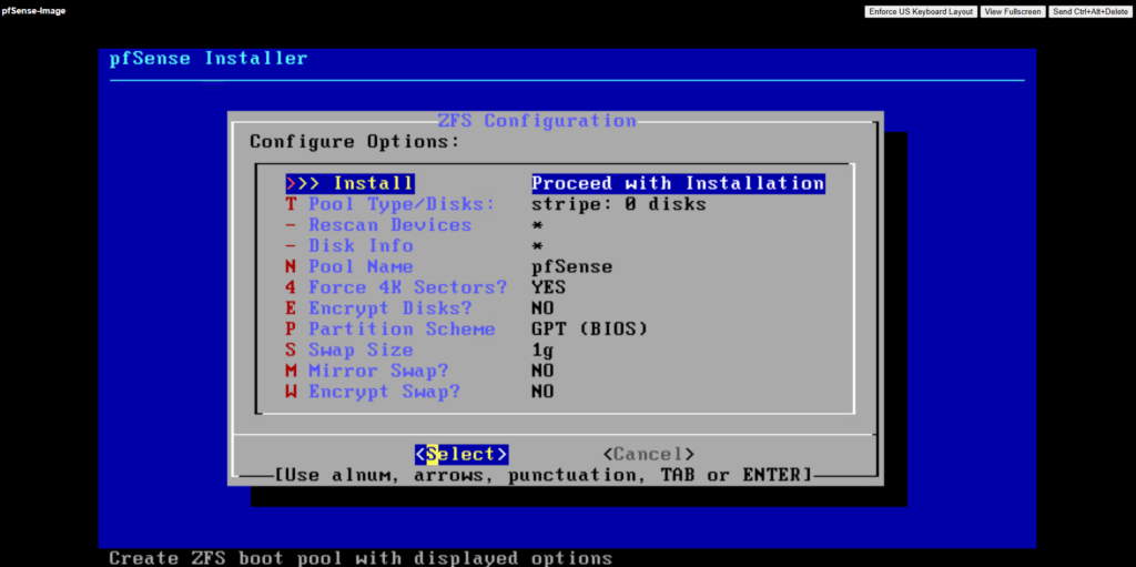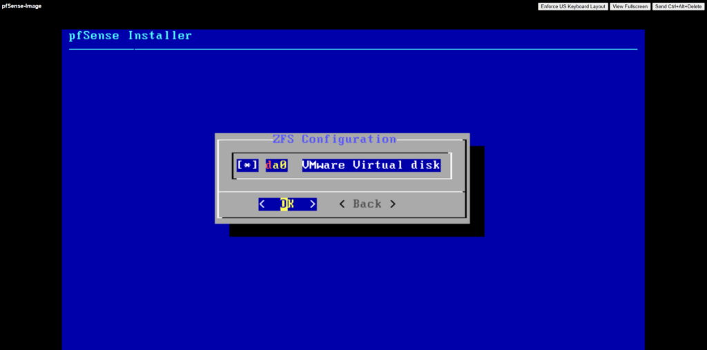 Select the attached disk as the installation target, this is where pfSense will actually be installed.