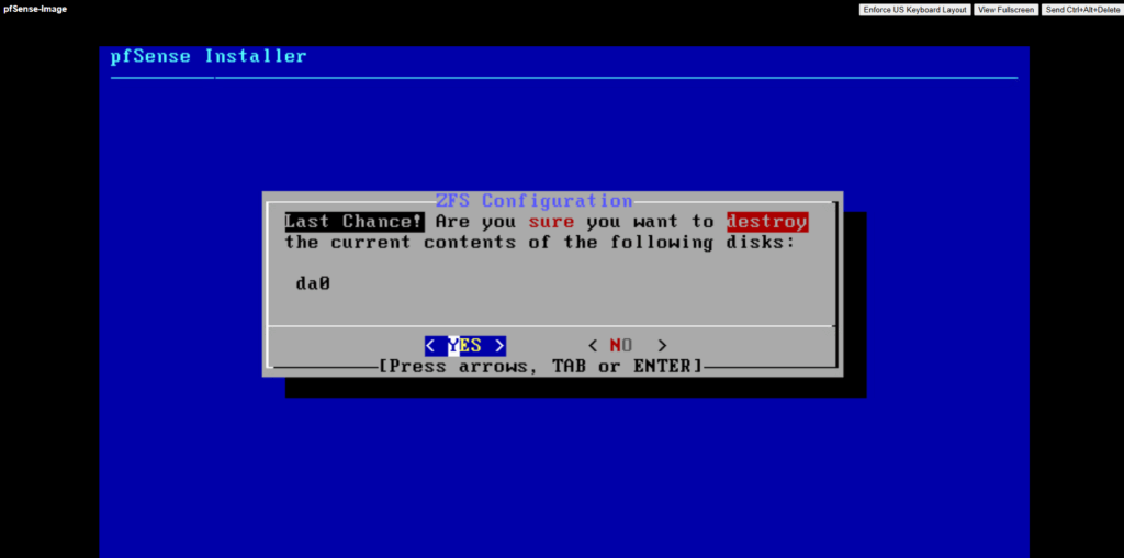 Confirm by pressing yes to finally install pfSense on the selected disk.