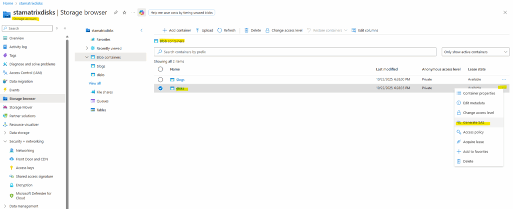 • Azure Storage Account and a container to upload the exported .vhd file.