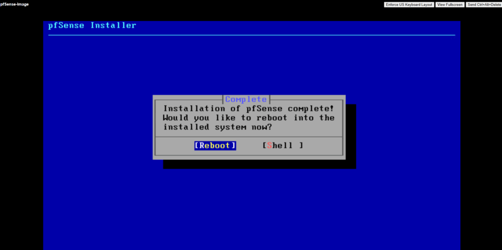 After the installation completes (usually in a few seconds) we need to reboot pfSense.