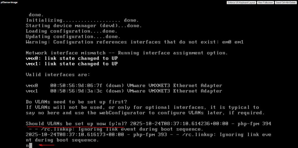 When the pfSense VM is booting, it launches as usual its initial configuration wizard, so next we need to use the serial console to perform the initial configuration where we need to assign the LAN + WAN interfaces on pfSense.