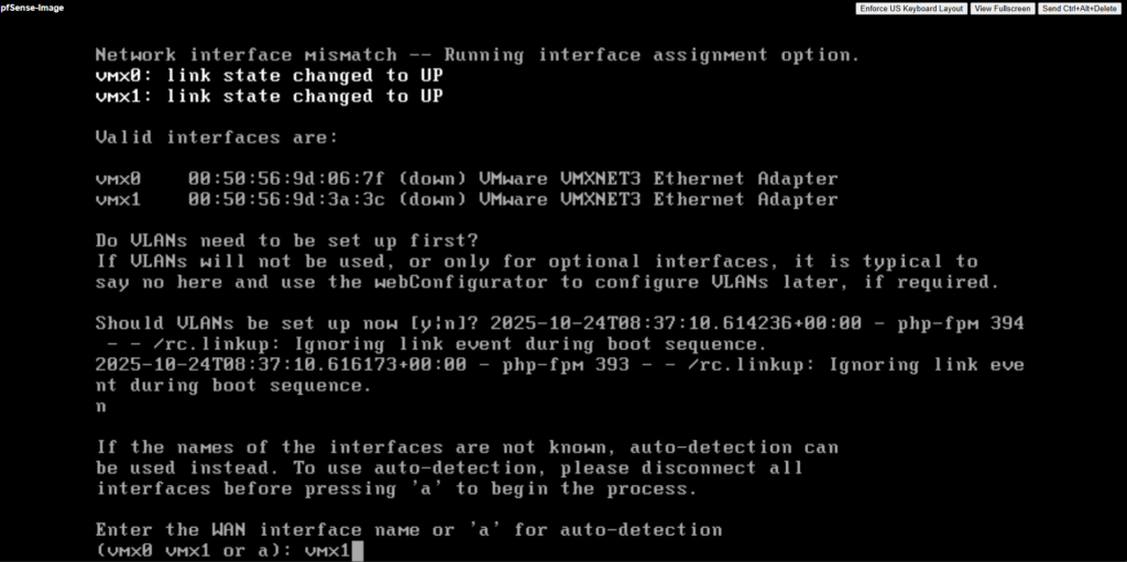 Assign the LAN (in my case vmx0) and WAN (in my case vmx1) interfaces.