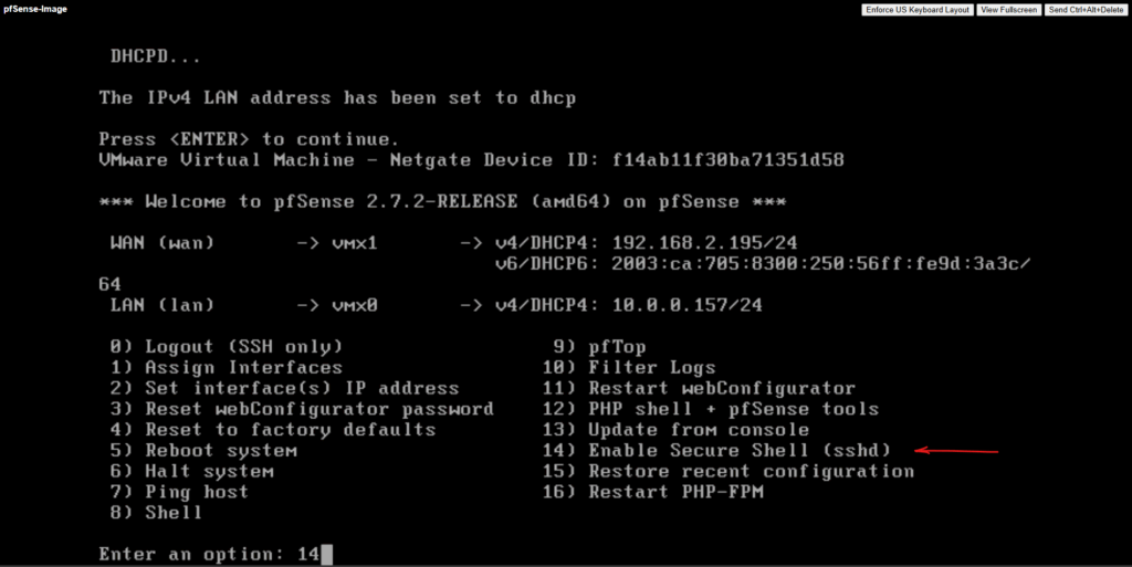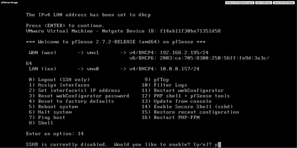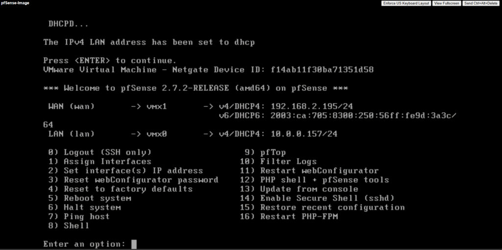 For the LAN interface I will enable DHCP to be able to connect to pfSense. Optionally we can of course also use a valid static IP address, finally we need to be able to connect to. The WAN interface I will leave on DHCP.