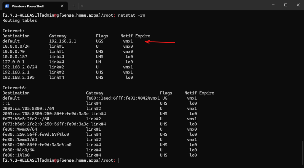On pfSense under Diagnostics -> Routes we can already see our new static route as shown below. I am already accessing here the pfSense web GUI direclty from a computer running in my on-prem vSphere lab environment.