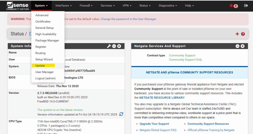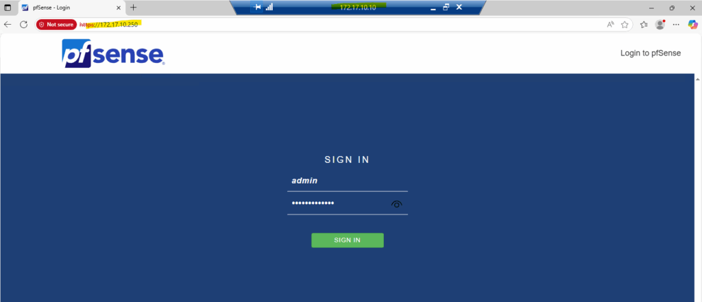With the network in place, we can now reach the pfSense WebGUI from any machine living on the same internal LAN subnet, pfSense automatically allows management access on its LAN interface right out of the box.
