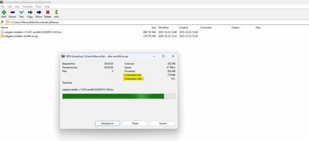 Windows natively can compress and extract ZIP archives just fine, but .gz is a different compression format that Windows doesn’t support natively, so you must use e.g. 7-Zip to decompress it or a PowerShell command that leverages .NET’s built-in GZipStream to decompress the pfSense .iso.gz downloads into a bootable .iso.