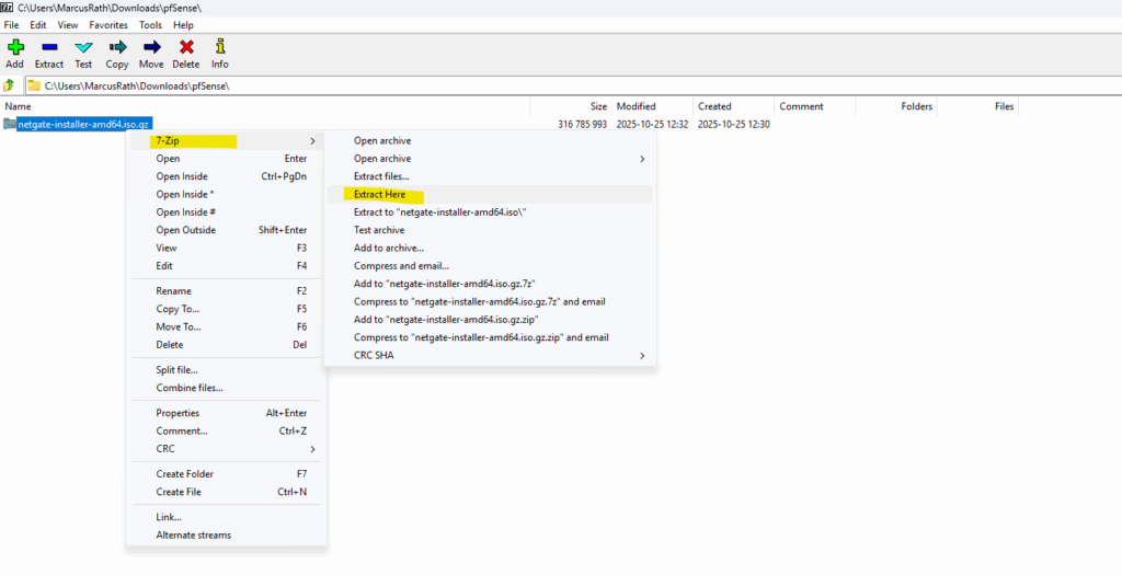 To decompress the .iso.gz file on Windows, we can use 7-Zip and select Extract Here, even though the menu wording may imply a full extraction. In this case, 7-Zip only removes the .gz compression layer and outputs the intact pfSense .iso, ready to mount in your hypervisor.