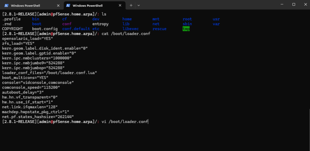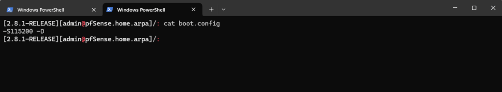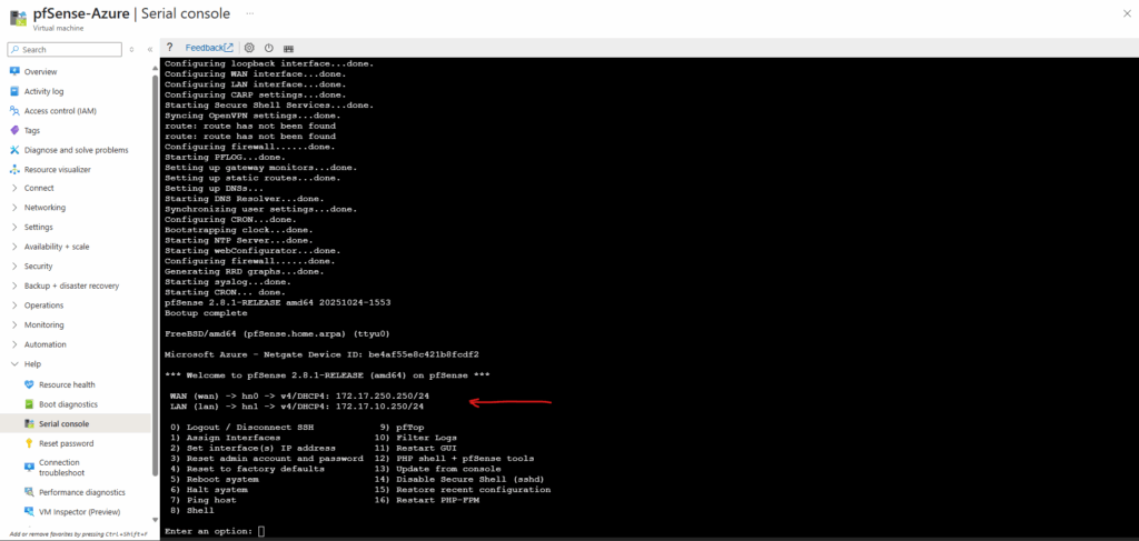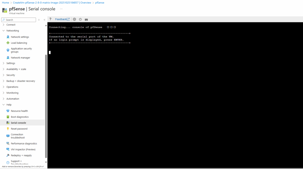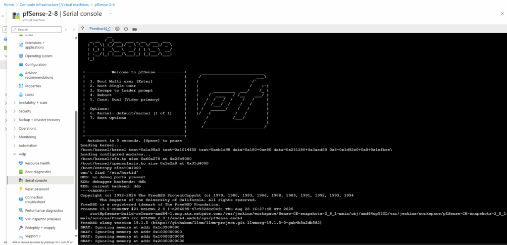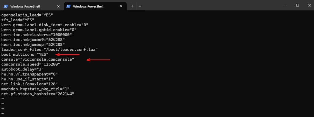 Further to later have access to pfSense’s serial console in Azure, we also need to adjust the /boot/loader.conf file.