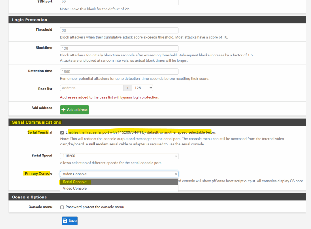 Before uploading the pfSense *.VHD disk, we also need to enable the serial terminal and for the primary console we need to select Serial Console in pfSense.