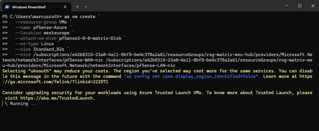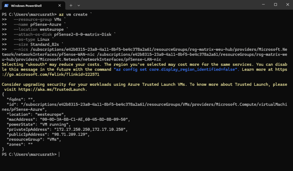 --nics /subscriptions/e42b...........a2a61/resourceGroups/rsg-matrix-weu-hub/providers/Microsoft.Network/networkInterfaces/pfSense-WAN-nic /subscriptions/e42b8..............a2a61/resourceGroups/rsg-matrix-weu-hub/providers/Microsoft.Network/networkInterfaces/pfSense-LAN-nic