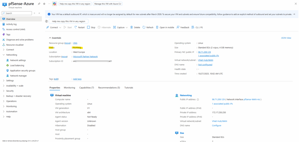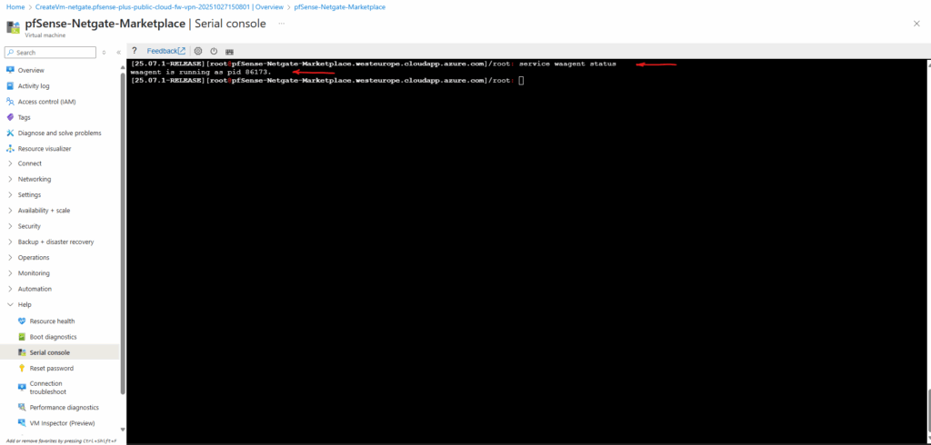 This makes the startup process much faster and avoids guest-agent related errors that occur when Azure tries to configure an unsupported OS like our pfSense appliance (FreeBSD 15 since 2.8.x).