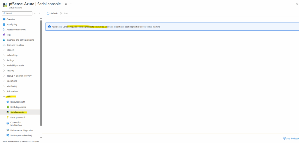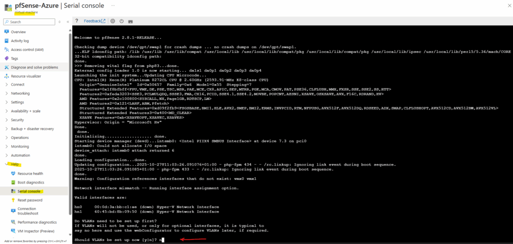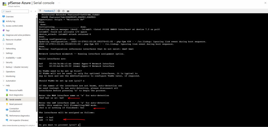 Because pfSense requires interactive setup on first boot, we must enable Boot Diagnostics to access the Azure Serial Console and complete the VLAN and interface assignment.Set up pfSense VM in vSphere