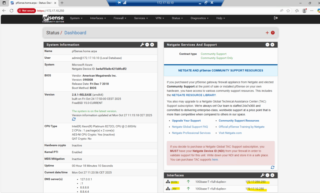 Even though the WAN NIC only holds a private IP, Azure seamlessly routes outbound traffic through the subnet’s virtual router (172.17.250.1), which in turn uses the assigned public IPv4 on that NIC (we previously created in Azure by using the az network nic create cmdlet) for internet access.