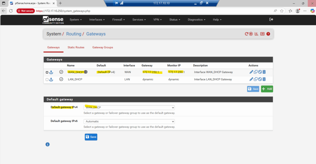 Therefore I will first need to add a new gateway on pfSense with the next hop IP address 172.17.10.1 and by using the internal LAN interface for.