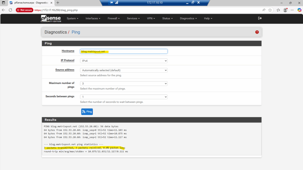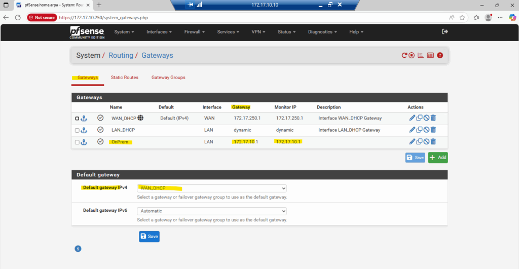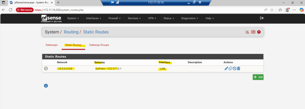 So far pfSense doesn’t no the route to my on-prem network (10.0.0.0/24), therefore it will route all traffic destined to by using its configured default gatway on the WAN interface (172.17.250.1).