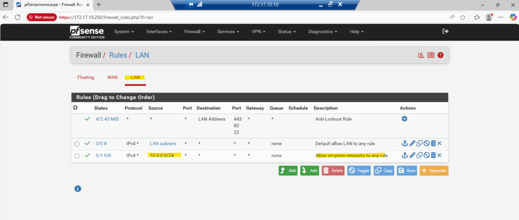 To enable that, I’ll add a firewall rule on the LAN interface allowing traffic from my on-prem network (10.0.0.0/24) to pfSense’s LAN address.