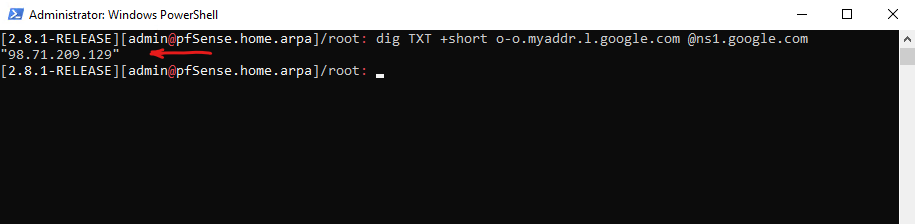 o-o.myaddr.l.google.com → The domain you’re querying. Google provides a special hostname here that returns your public IP in a TXT record.