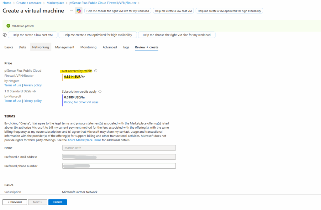 If we just want a ready-to-run appliance, Netgate offers pfSense directly in the Azure Marketplace, complete with support and updates, though it comes at a monthly cost starting around €70 per month.