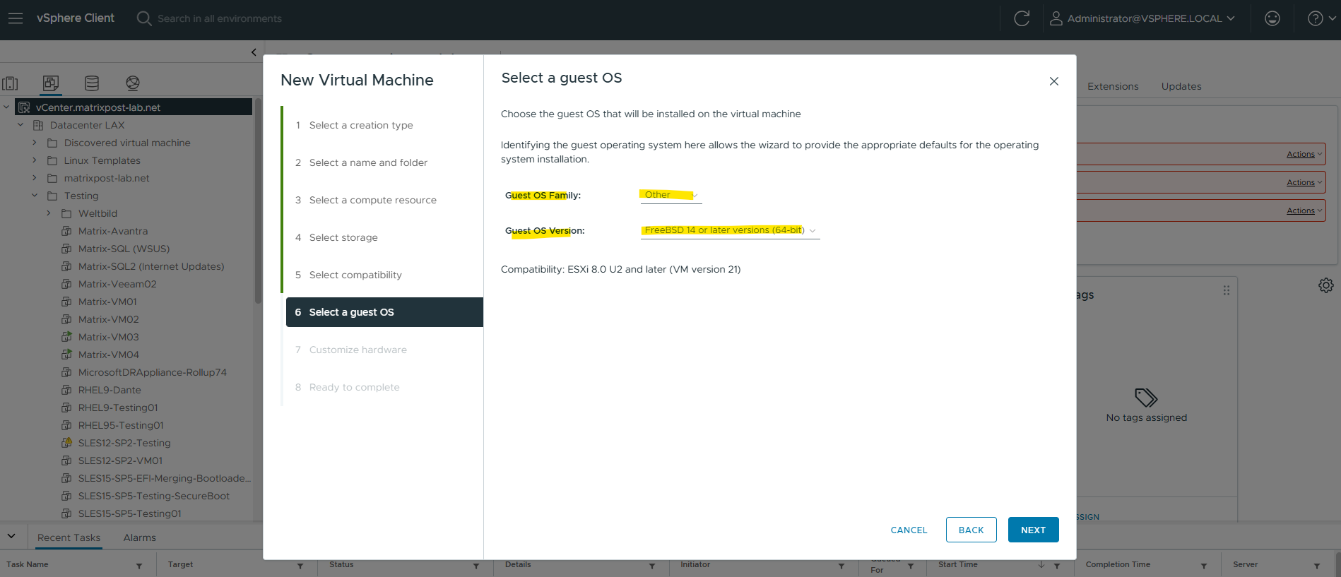 For the guest OS family we need to select Other and for the OS version select FreeBSD 14 or later versions (64-bit).