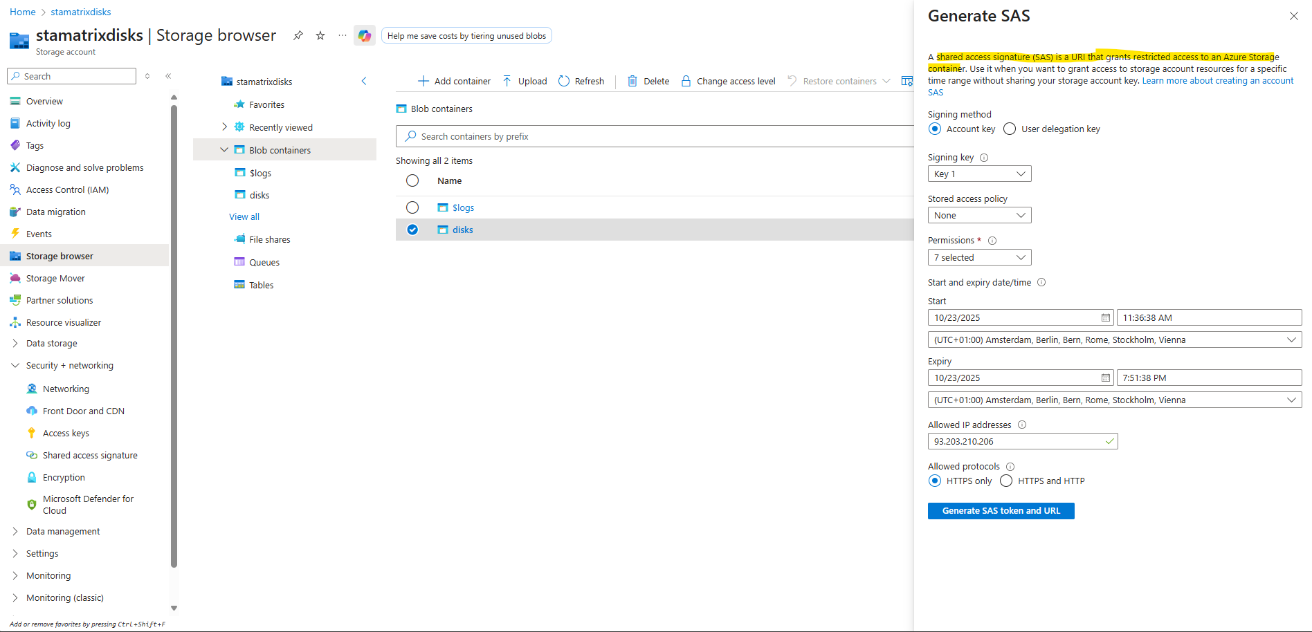 • Azure Storage Account and a container to upload the exported .vhd file.
