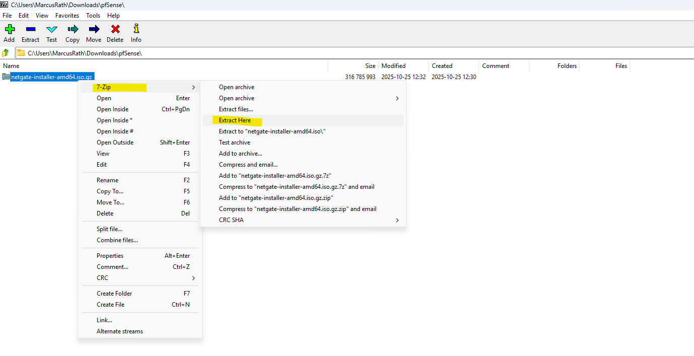 To decompress the .iso.gz file on Windows, we can use 7-Zip and select Extract Here, even though the menu wording may imply a full extraction. In this case, 7-Zip only removes the .gz compression layer and outputs the intact pfSense .iso, ready to mount in your hypervisor.
