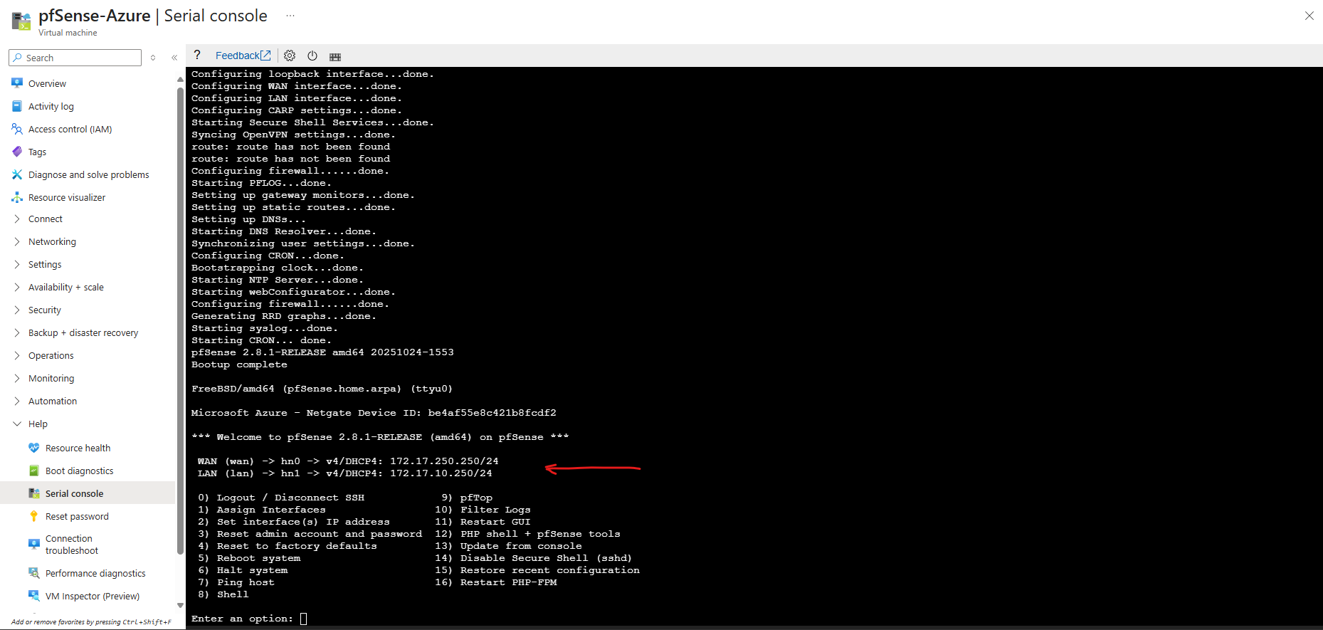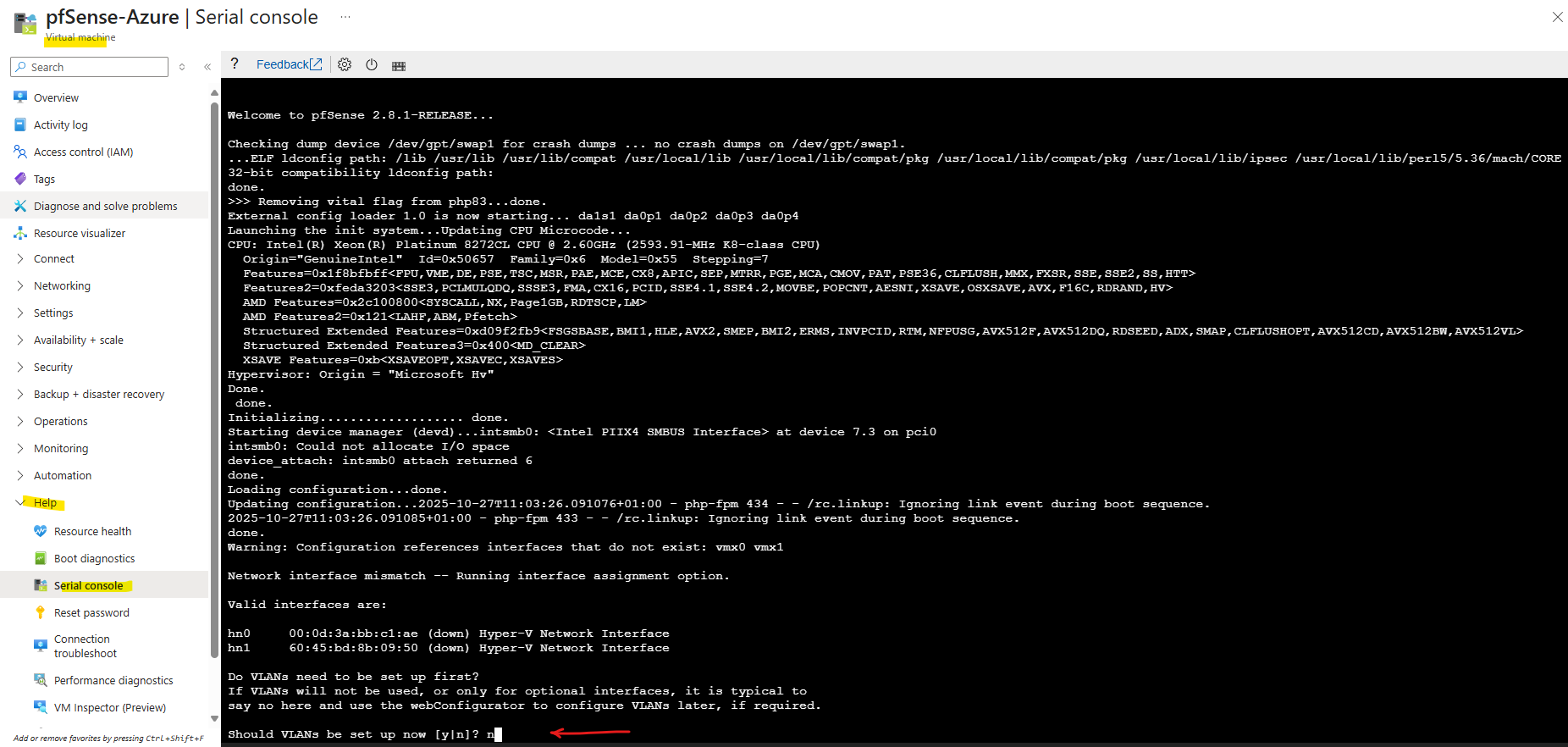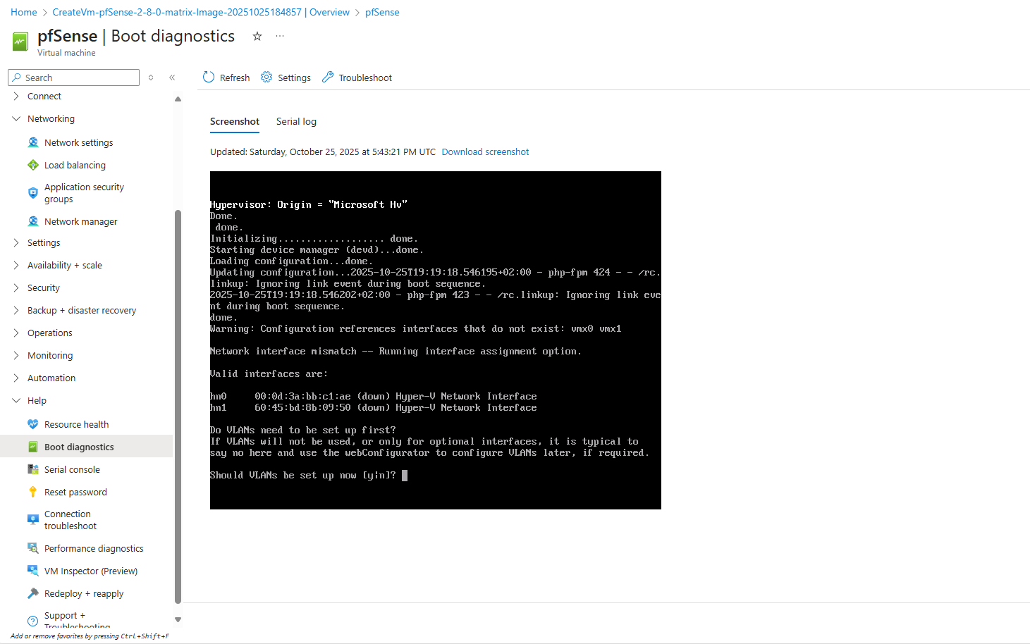 Because pfSense requires interactive setup on first boot, we must enable Boot Diagnostics to access the Azure Serial Console and complete the VLAN and interface assignment.Set up pfSense VM in vSphere