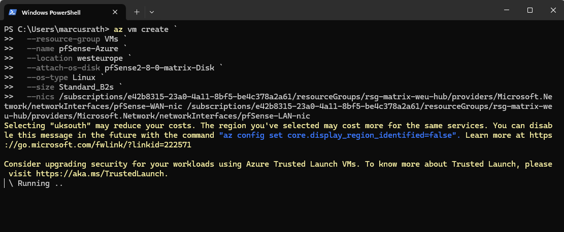 --nics /subscriptions/e42b...........a2a61/resourceGroups/rsg-matrix-weu-hub/providers/Microsoft.Network/networkInterfaces/pfSense-WAN-nic /subscriptions/e42b8..............a2a61/resourceGroups/rsg-matrix-weu-hub/providers/Microsoft.Network/networkInterfaces/pfSense-LAN-nic