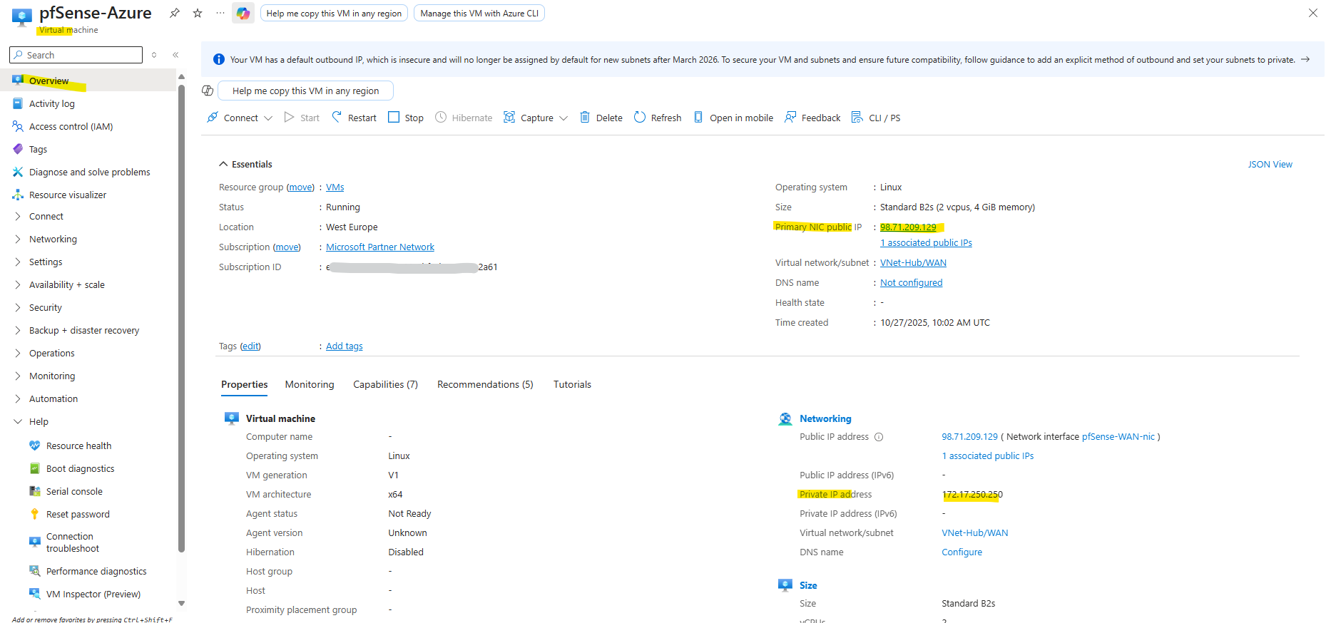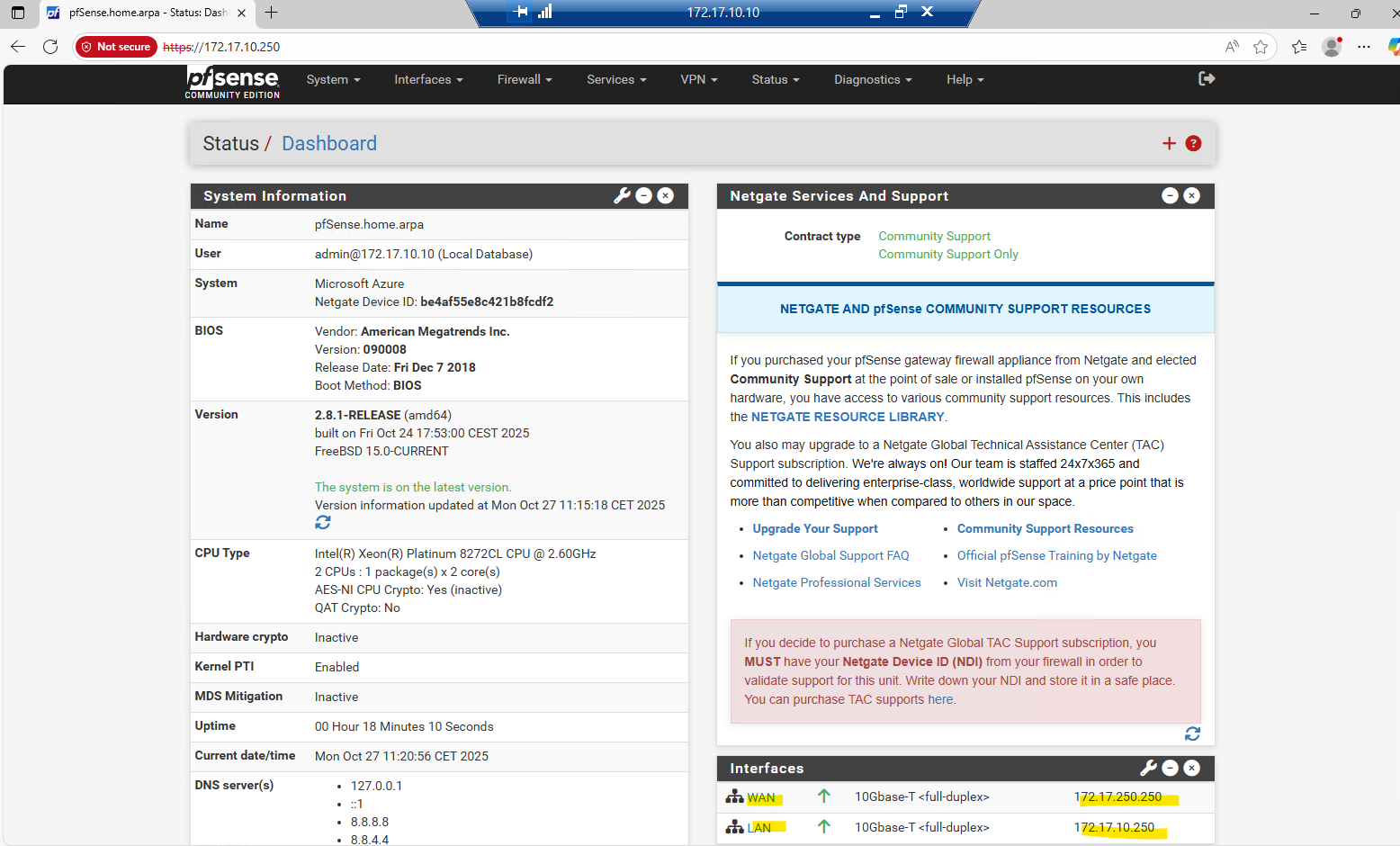 Azure’s SDN fabric hands out these assigned IPs via DHCP, ensuring the pfSense interface settings always match the networking configuration defined in the portal.