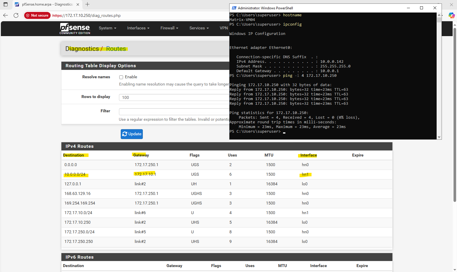 On pfSense under Diagnostics -> Routes we can already see our new static route as shown below. I am already accessing here the pfSense web GUI direclty from a computer running in my on-prem vSphere lab environment.
