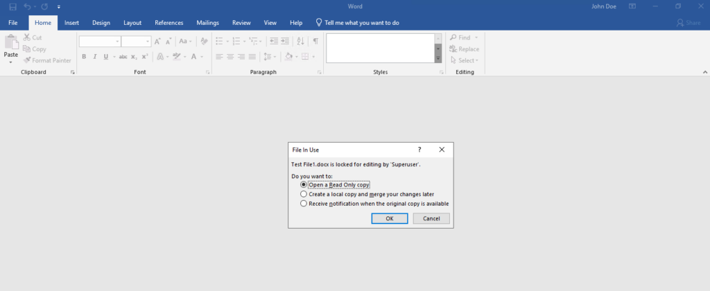 When I now open the same file for editing from the second Windows client, now Word will show me three options with: Open in read-only mode, Create a local copy and merge your changes later and Receive notification when the original copy is available.