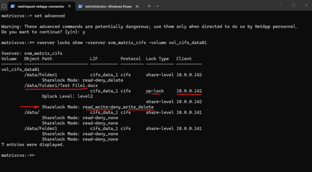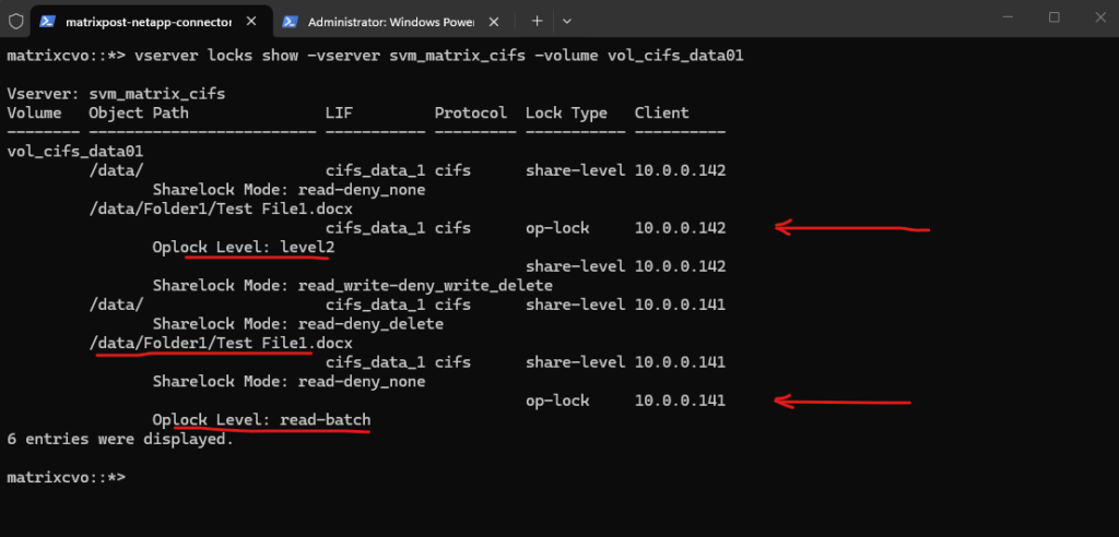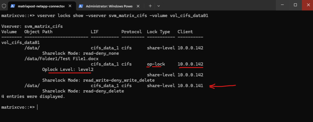 The vserver locks show output confirms this behavior. While the first client holds share-level and oplock entries for Test File1.docx, the second client only holds minimal share-level locks on the root path (/data/) with permissive modes such as none-deny_none and read-deny_none. These locks reflect directory access for browsing purposes and do not restrict file modifications.