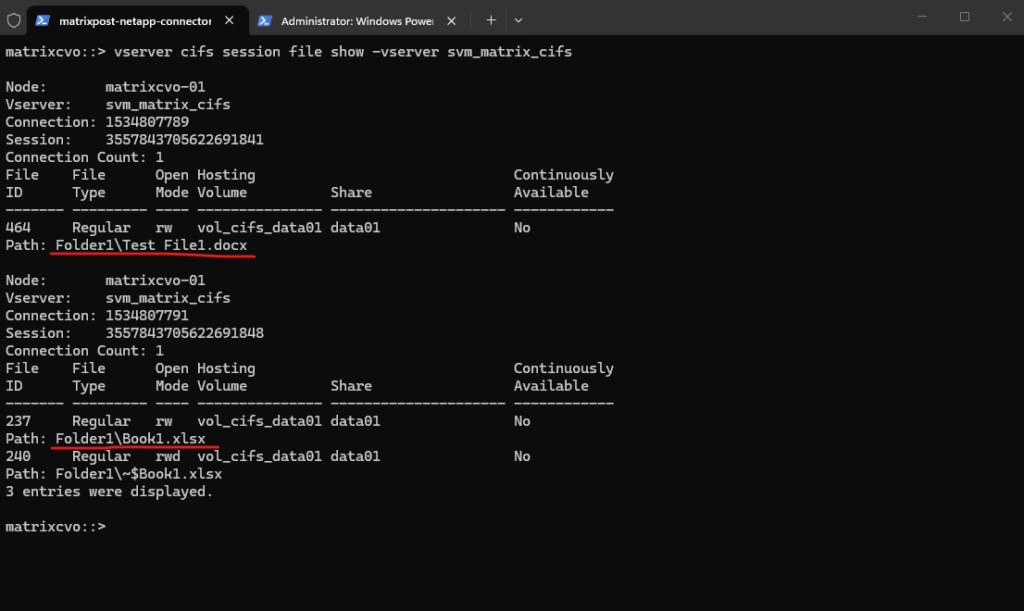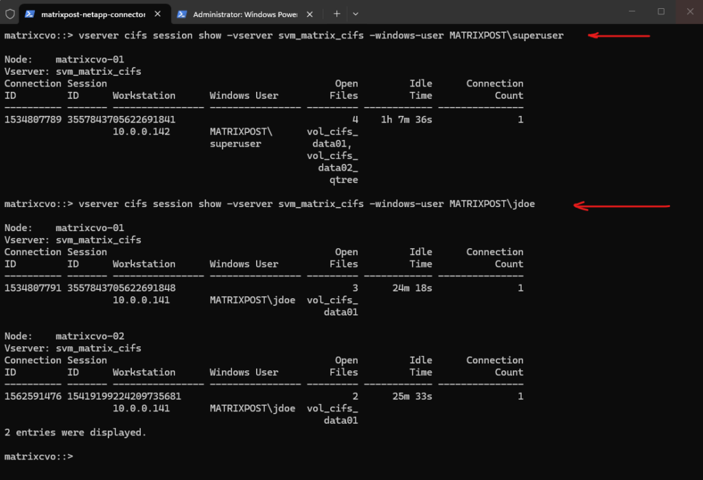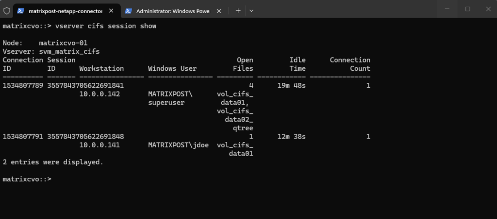In this example, client 10.0.0.142 (MATRIXPOST\superuser) has multiple files open across different shares, while 10.0.0.141 (MATRIXPOST\jdoe) maintains a separate session with fewer open files. This clearly illustrates how ONTAP tracks each SMB session independently, even when multiple users access the same SVM simultaneously.