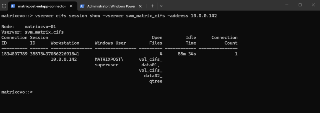matrixcvo::> vserver cifs session show -vserver svm_matrix_cifs -windows-user MATRIXPOST\superuser