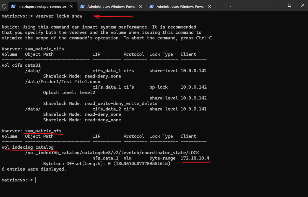 The output above shows two CIFS sessions in my lab environment. For demonstration purposes, I intentionally connected from two separate Windows clients, 10.0.0.142 (MATRIXPOST\superuser) and 10.0.0.141 (MATRIXPOST\jdoe), to simulate concurrent user access. This controlled setup allows us to clearly observe how ONTAP tracks SMB sessions and enforces locking behavior across multiple clients.
