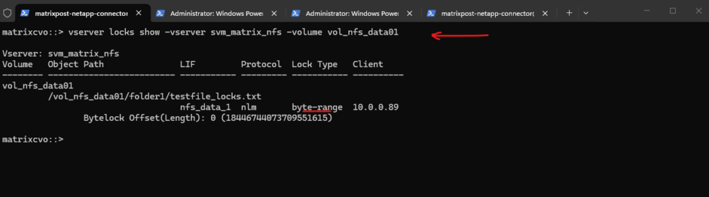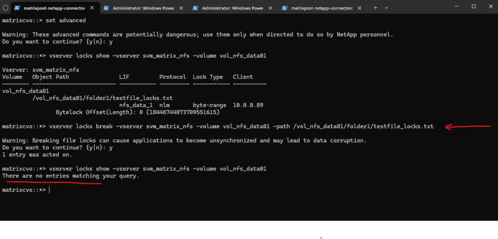 matrixcvo::*> vserver locks break -vserver svm_matrix_nfs -volume vol_nfs_data01 -path /vol_nfs_data01/folder1/testfile_locks.txt