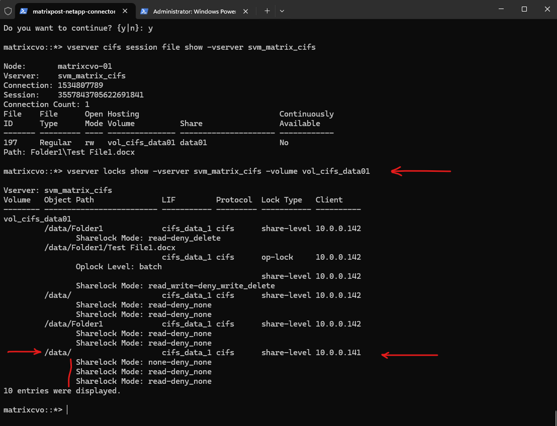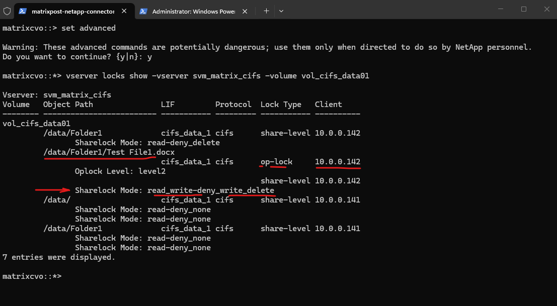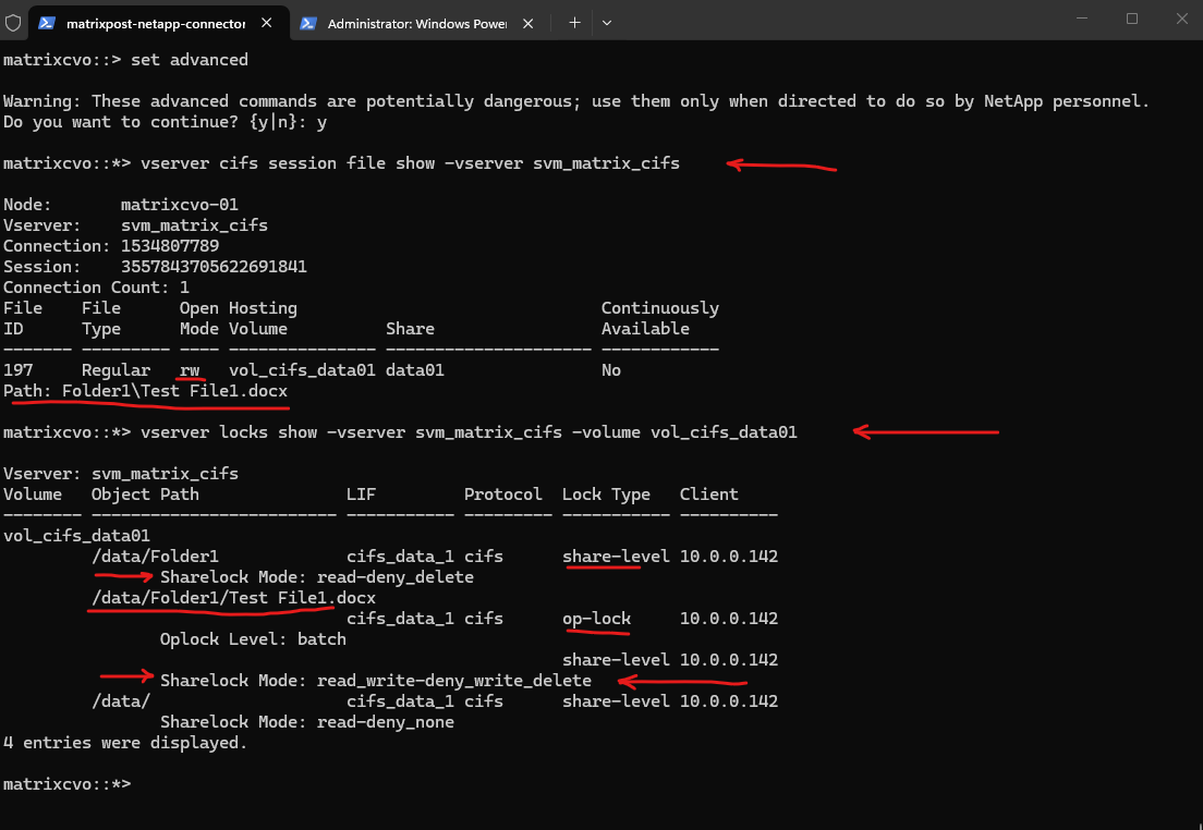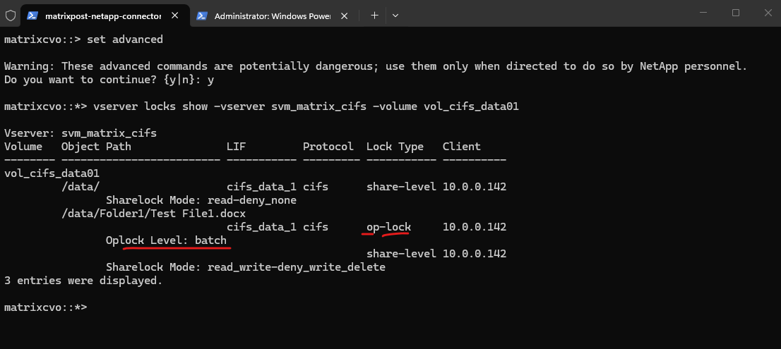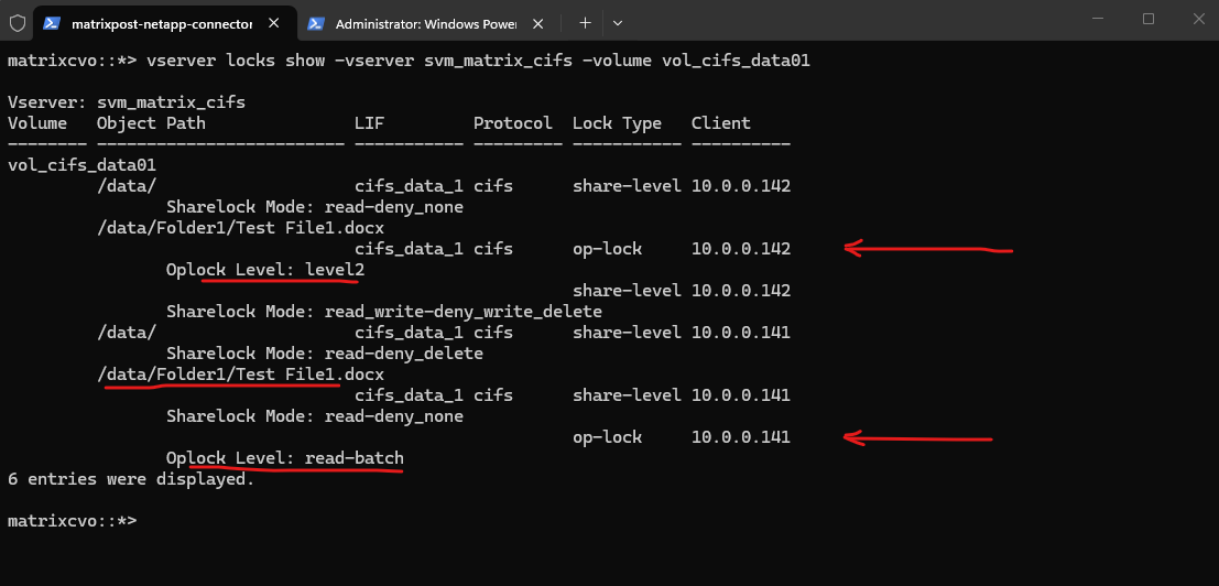 The vserver locks show output confirms this behavior. While the first client holds share-level and oplock entries for Test File1.docx, the second client only holds minimal share-level locks on the root path (/data/) with permissive modes such as none-deny_none and read-deny_none. These locks reflect directory access for browsing purposes and do not restrict file modifications.