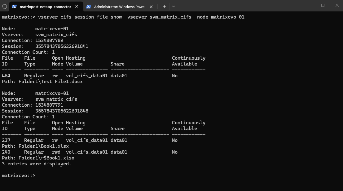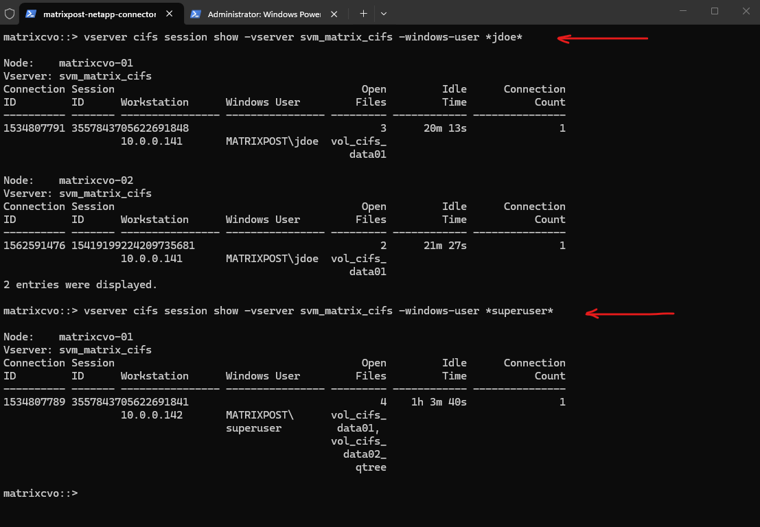 In this example, client 10.0.0.142 (MATRIXPOST\superuser) has multiple files open across different shares, while 10.0.0.141 (MATRIXPOST\jdoe) maintains a separate session with fewer open files. This clearly illustrates how ONTAP tracks each SMB session independently, even when multiple users access the same SVM simultaneously.