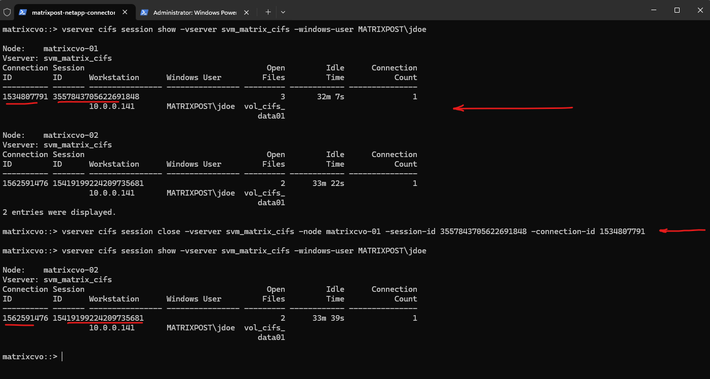 matrixcvo::> vserver cifs session close -vserver svm_matrix_cifs -node <node name> -session-id <SESSION_ID> -connection-id <CONNECTION_ID>