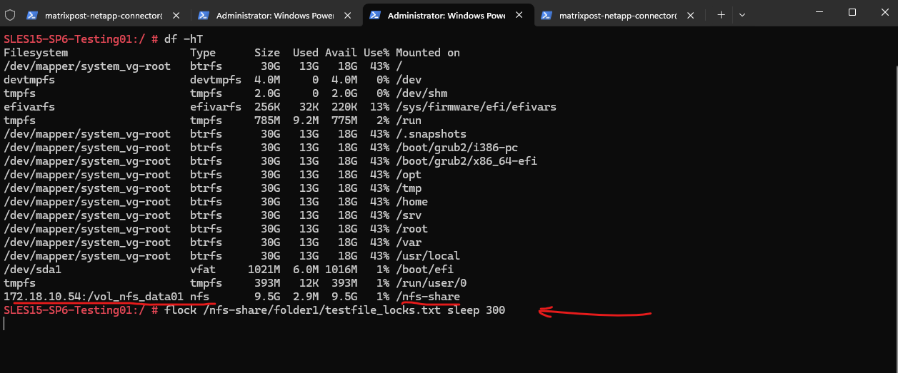 SLES15-SP6-Testing01:/ # flock /nfs-share/folder1/testfile_locks.txt sleep 300