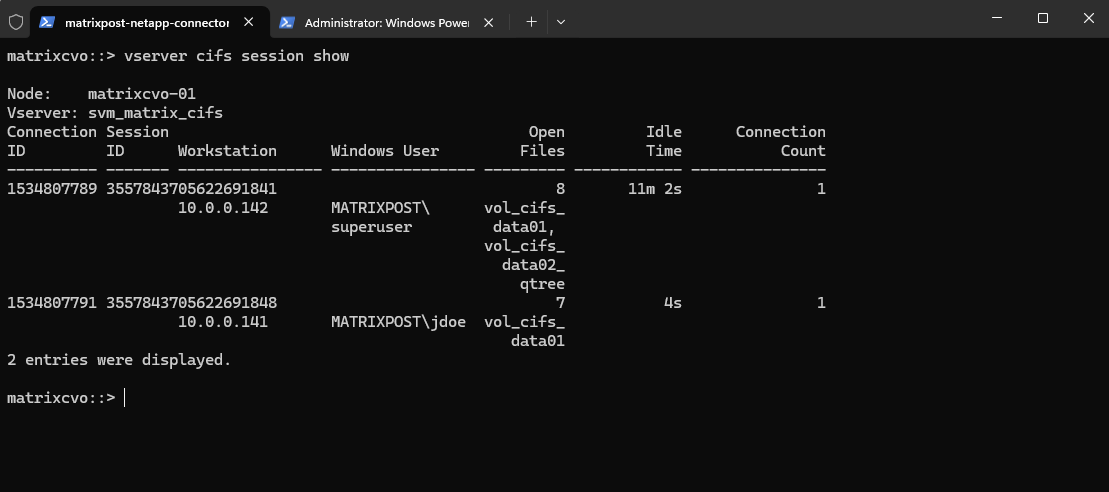matrixcvo::> vserver cifs session show -vserver svm_matrix_cifs -windows-user MATRIXPOST\jdoe
