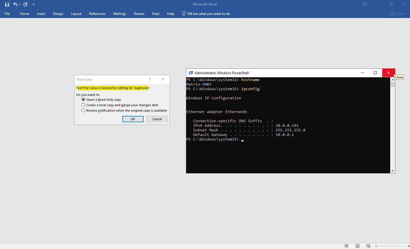 To demonstrate this behavior, I open the Word document “Test File1.docx” from the NetApp SMB share \\172.18.10.50\Folder1 on a Windows client with the IP address 10.0.0.142.