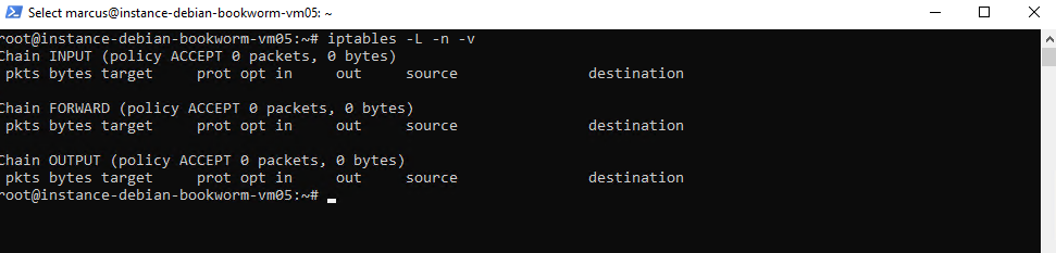 Below INPUT, FORWARD, OUTPUT chains all have policy ACCEPT. That means there is no active firewall on this Debian VM.