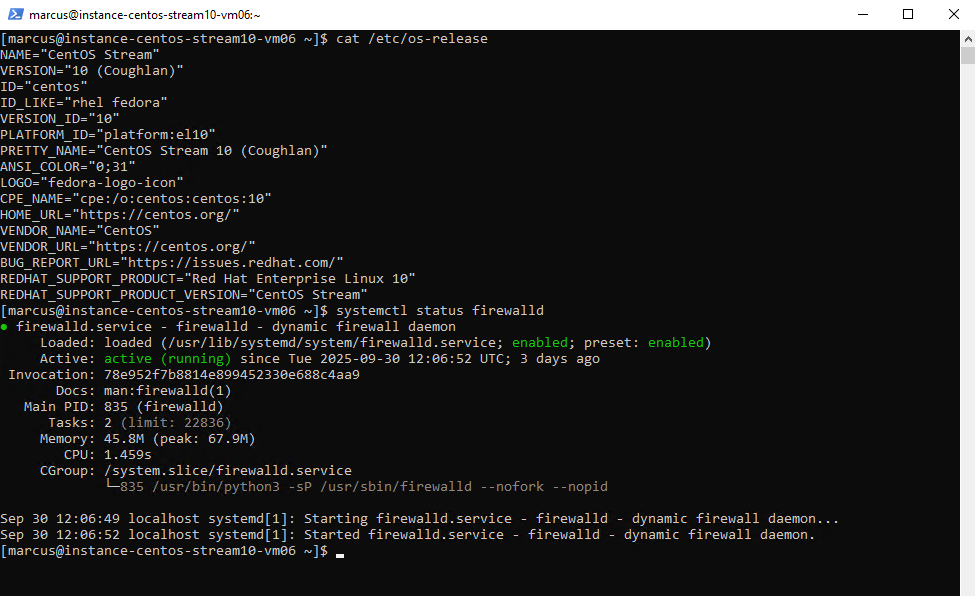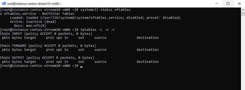Below we can see that CentOS 10 (Stream) still using iptables as user-space tool to configure the Netfilter framework.