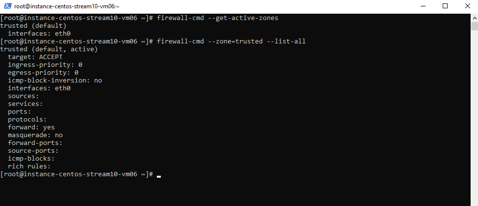 The output shows that the trusted zone is active on eth0 and also set as the default zone. Its target is ACCEPT, which means all incoming traffic is allowed without restrictions. No specific services, ports, or custom rules are defined, so the firewall here effectively behaves like it is disabled.