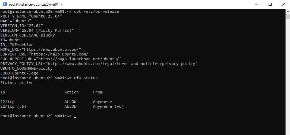 Here the UFW utility is installed and enabled and only inbound TCP 22 traffic is allowed.