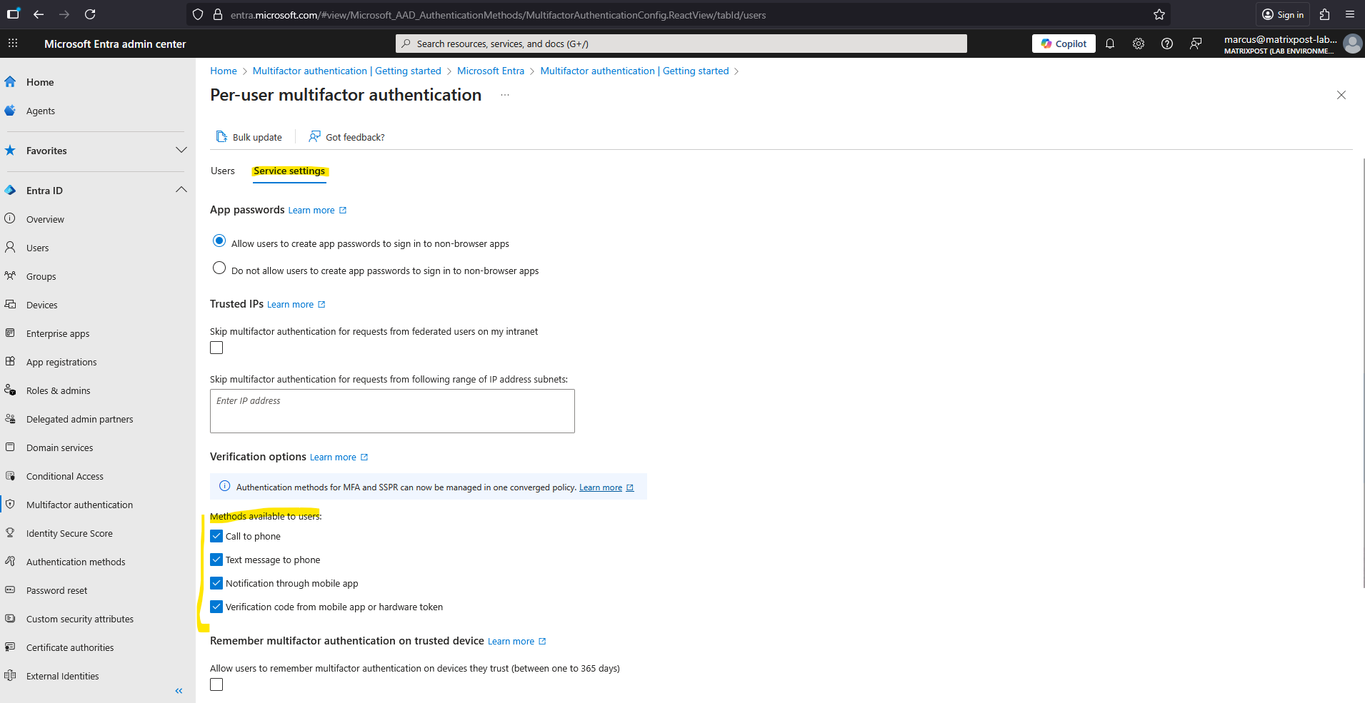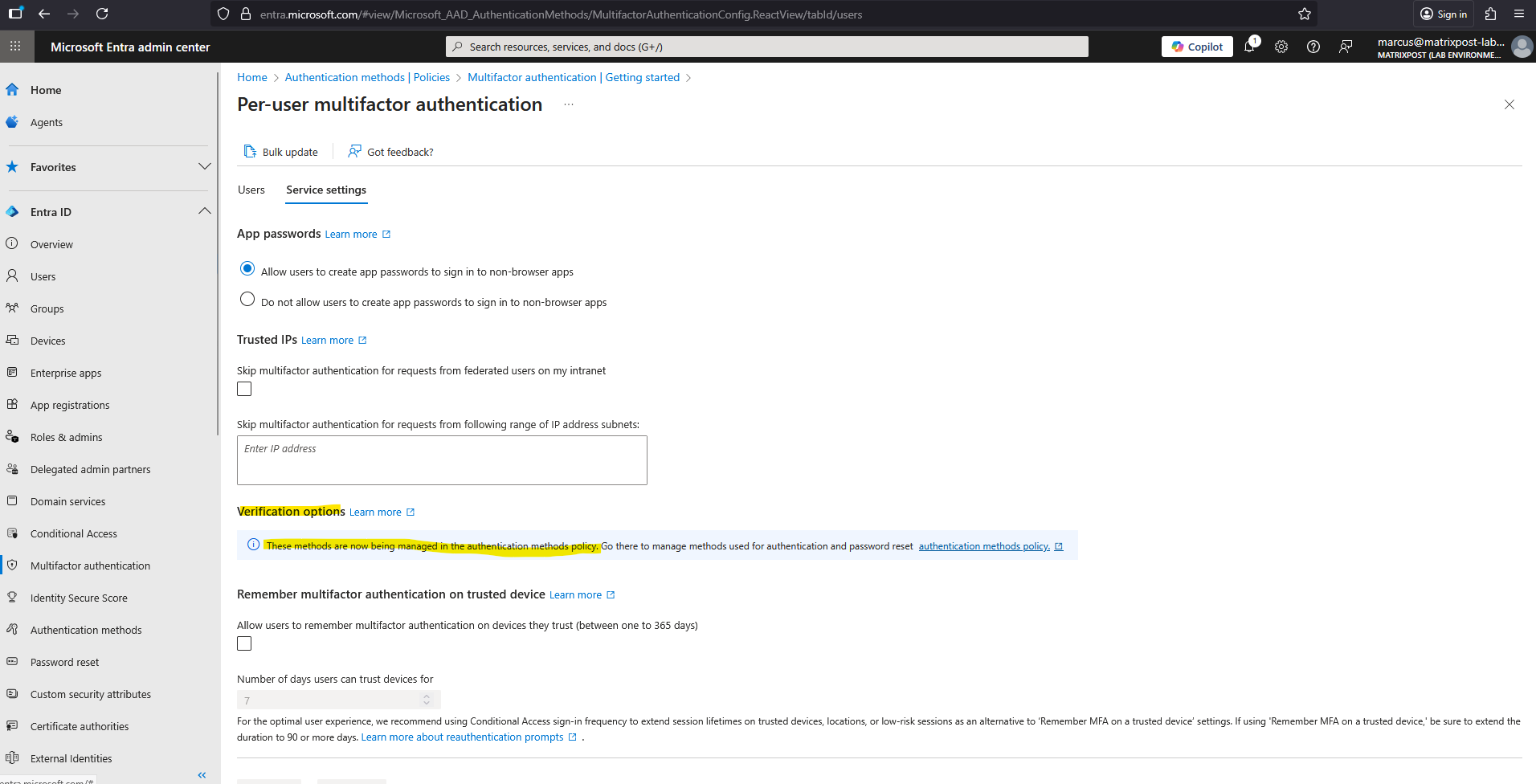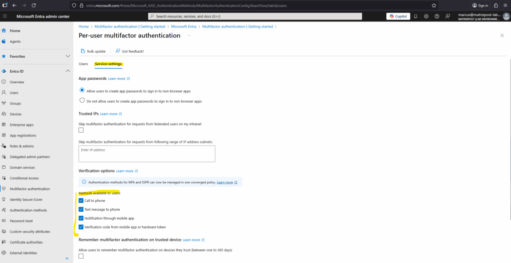 - Authentication methods policy (if used)